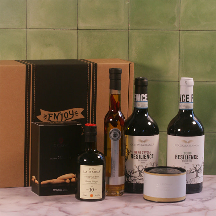 Diese Getränkebox kombiniert charaktervolle sizilianische Weine mit handwerklich hergestellten Köstlichkeiten aus Südeuropa.