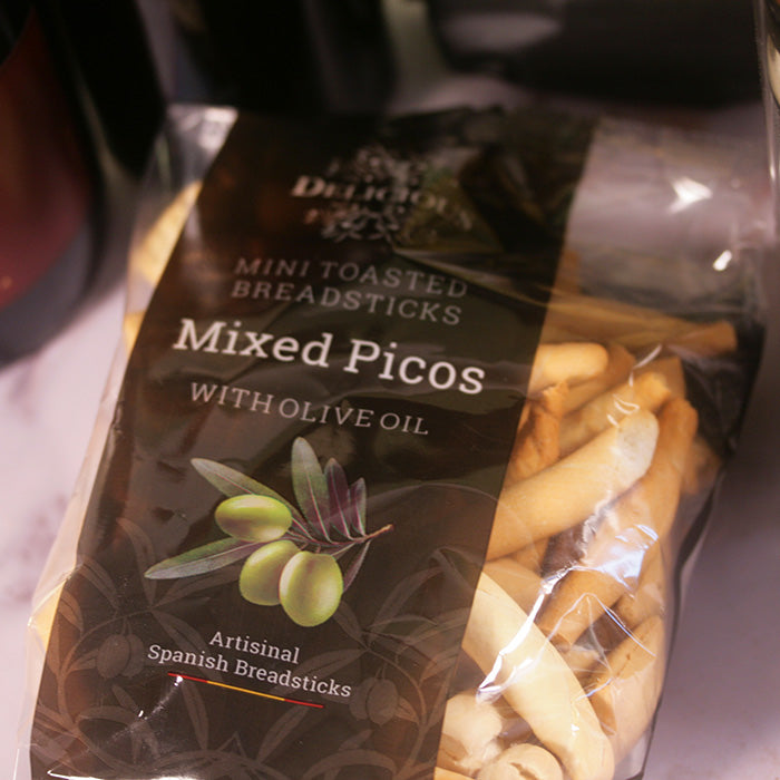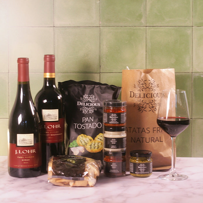 Ein geschmackvolles Geschenk mit zwei kraftvollen kalifornischen Weinen von J. Lohr : Syrah und Cabernet Sauvignon . Zusammen mit einer Auswahl an mediterranen Köstlichkeiten wie knusprigen Patatas Fritas, Pan Tostado, gemischten Picos, einer Cocktailbox mit drei Tapenaden und Pesto alla Genovese ist dieses Paket ein komplettes Geschenk für jeden Anlass.